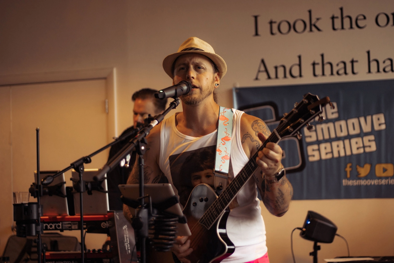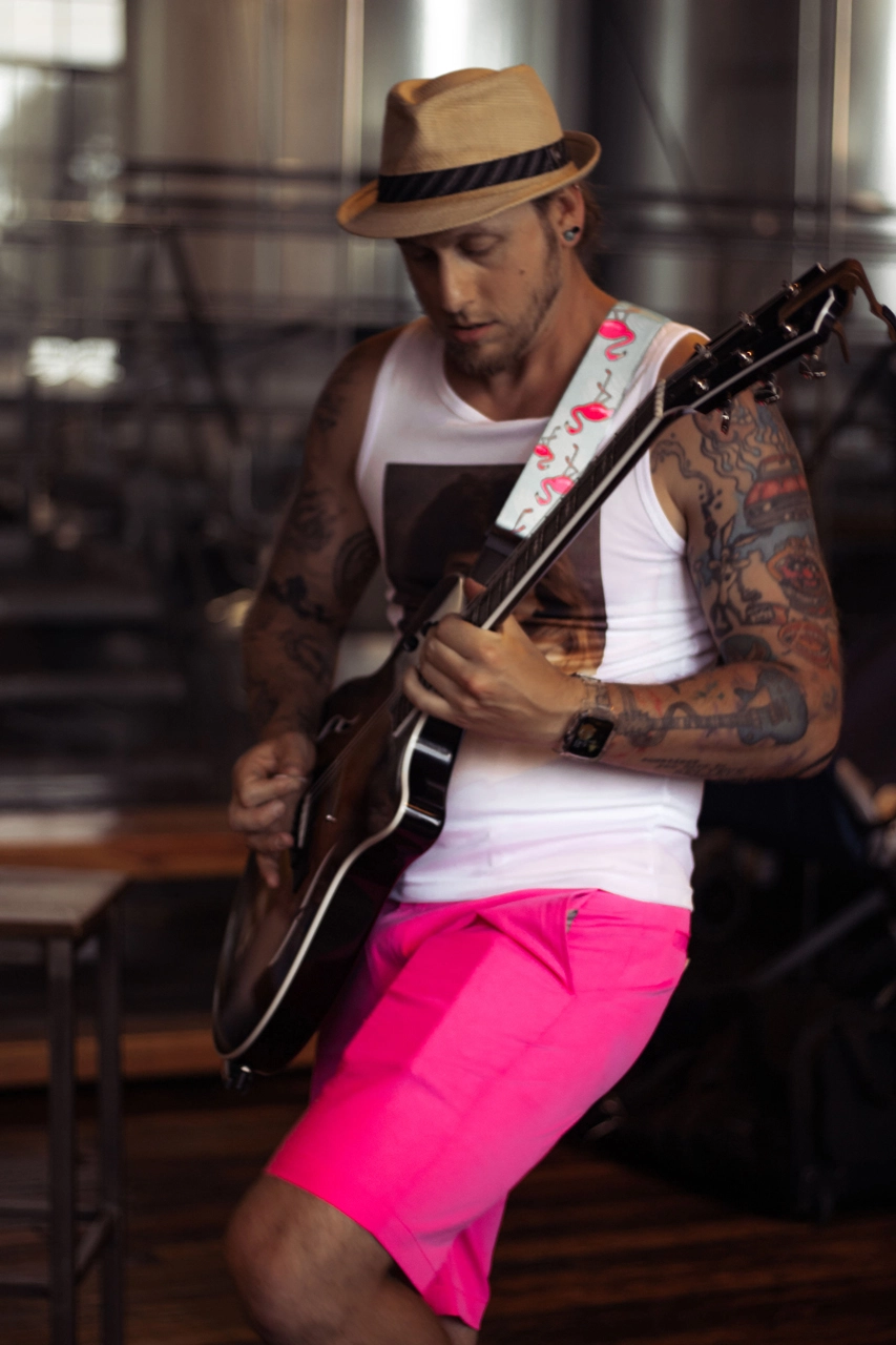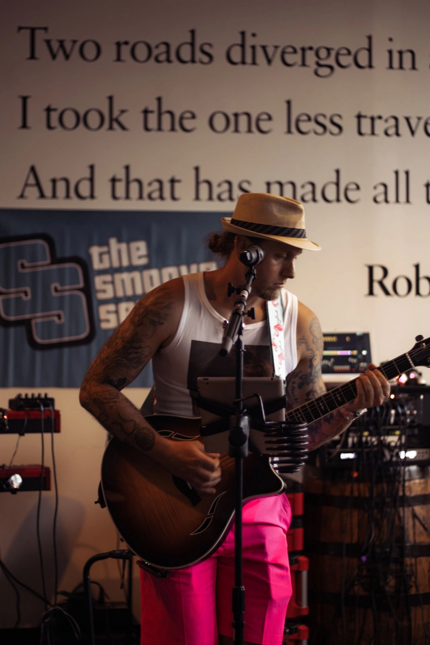 Close up of Mike Angeli from Smoove Series playing guitar at Two Roads Brewing in Stratford, CT