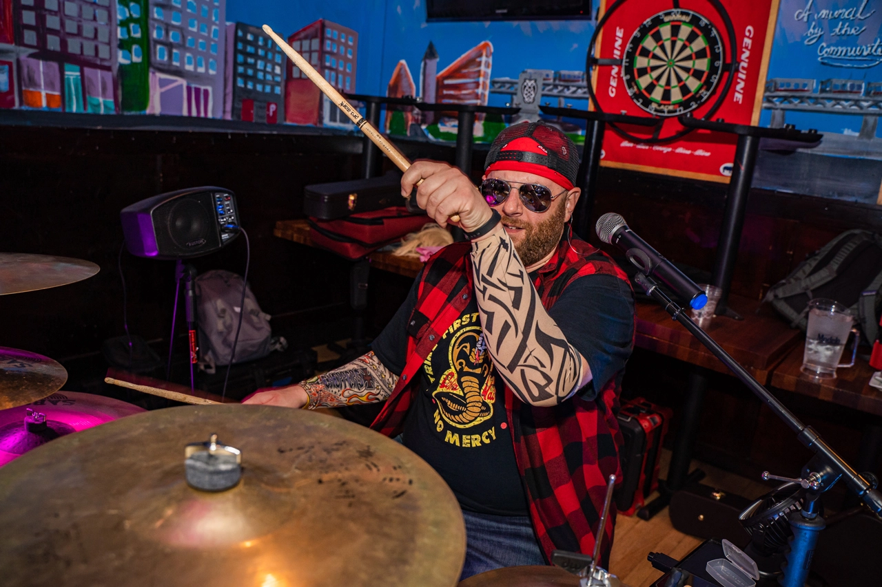 Joe Saad looking at camera from the side playing drums at Bleacher's Bar in Bristol, CT