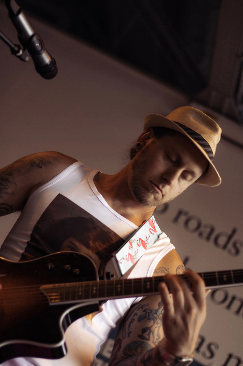 Close up of Mike Angeli playing guitar with him turned on an angle at Two Roads Brewing at Stratford, CT