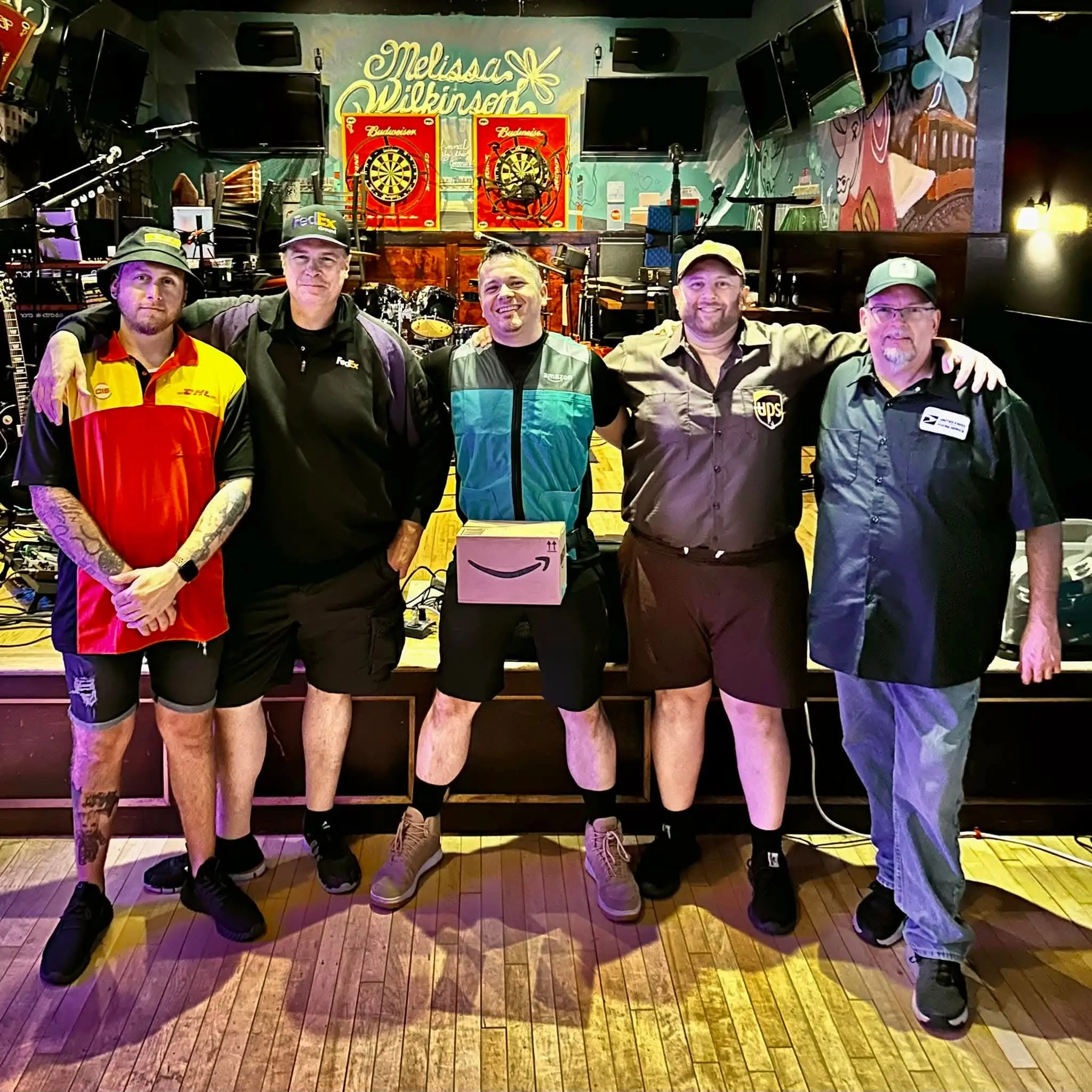 Smoove Series dressed up like various delivery company employees for Halloween Show in 2023 at The Blind Rhino in South Norwalk, CT