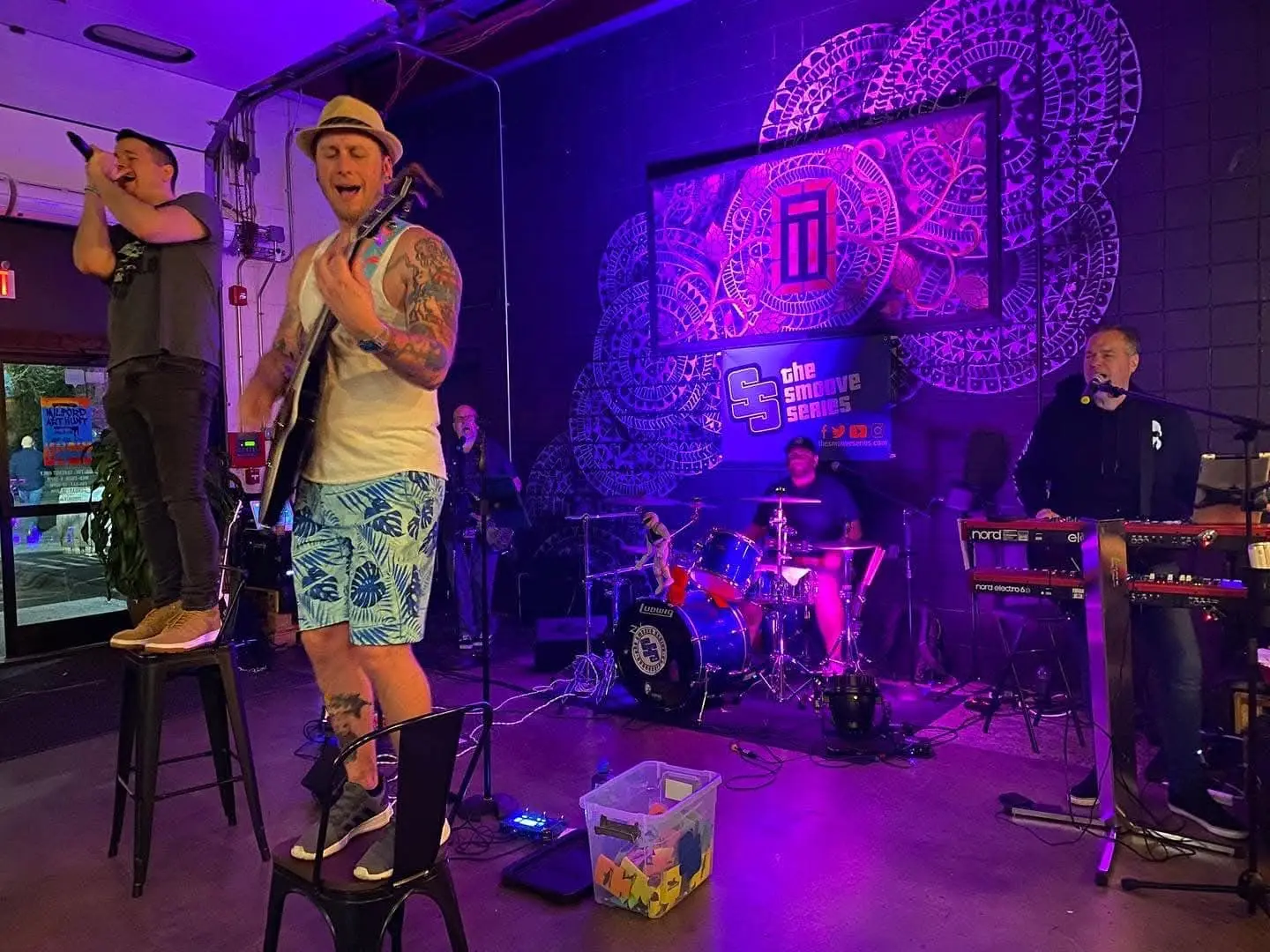 Smoove Series performing live at Tribus Beer in Milford, CT with Joe Scovill singing and standing on chair