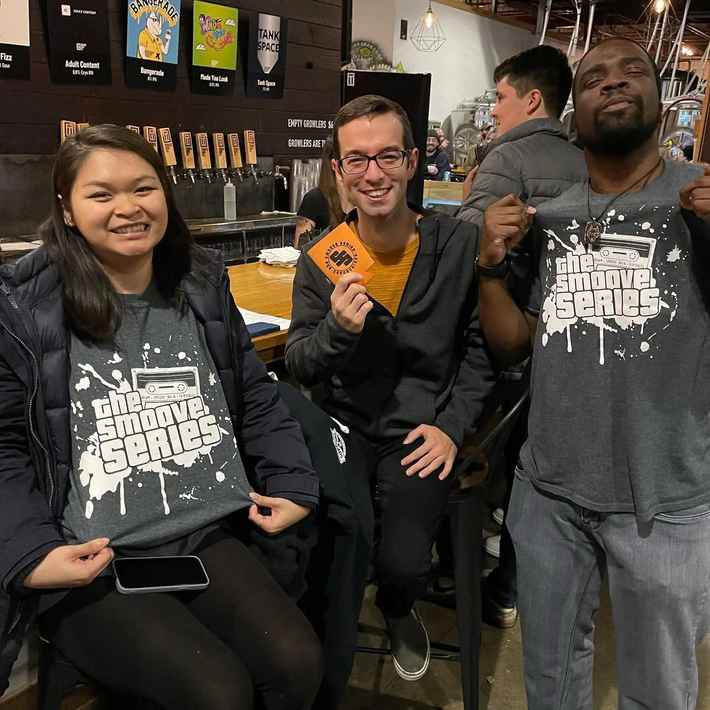 New fans wearing Smoove Series tshirts at Back East Brewery in Bloomfield, CT