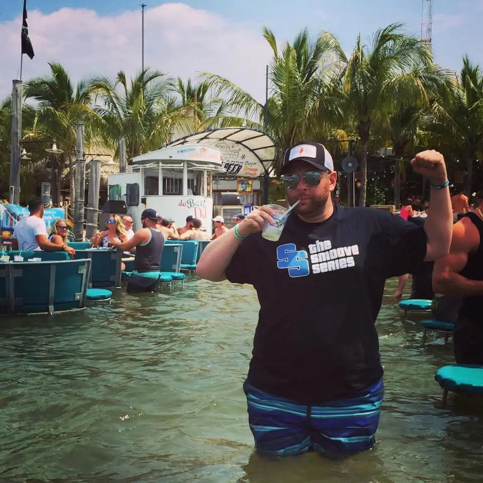 Joe Saad of Smoove Series party in the water wearing Smoove Series vintage tshirt