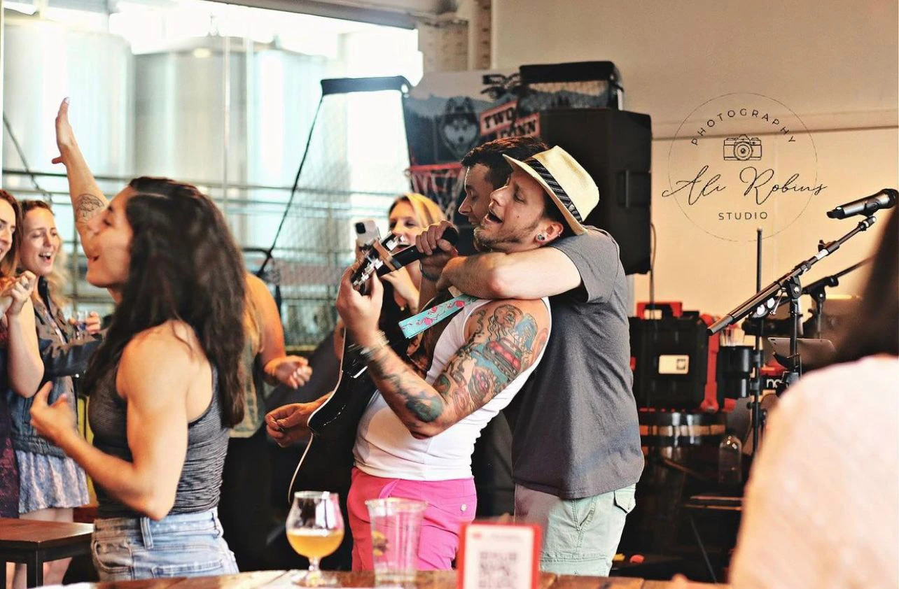 Mike Angeli and Joe Scovill hugging during performance at Two Roads Brewing in Stratford, CT