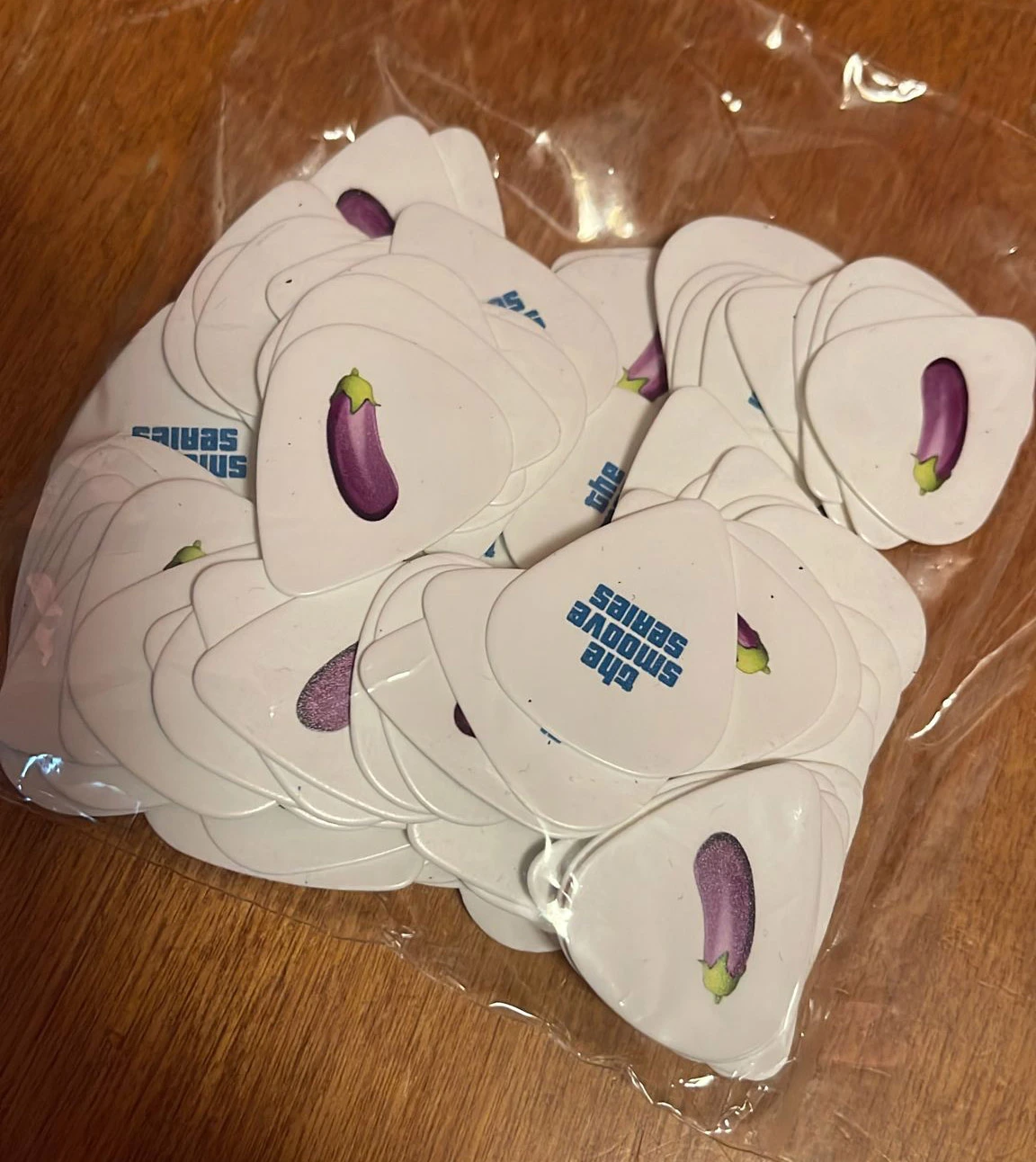 Custom guitar picks with Eggplant Emoji for Smoove Series live performances